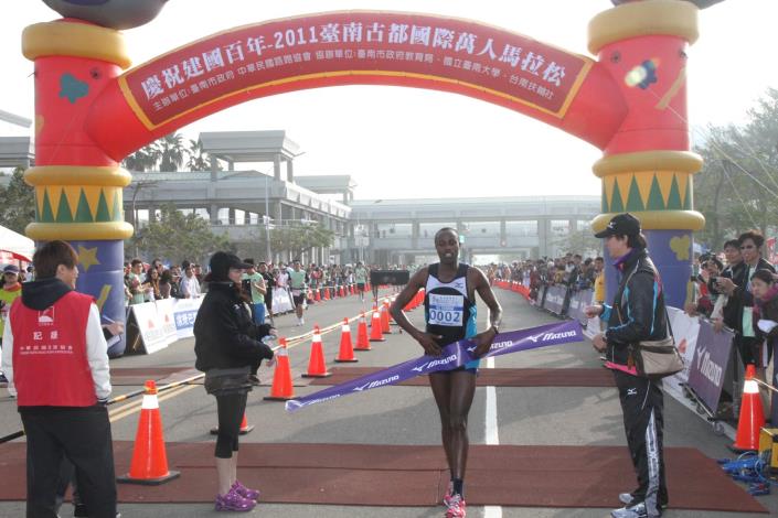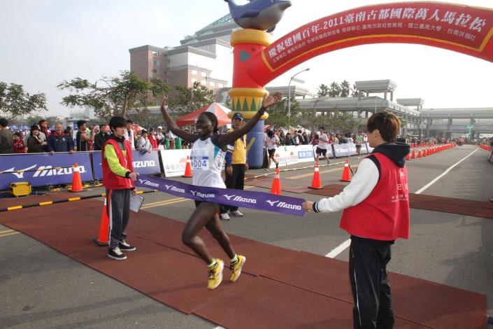 接著肯亞選手仍是全場焦點,四位黑旋風的讓台南鄉親大開眼界,Joseph Kimelilac 喬瑟夫.拉葛在25公里處韌帶拉傷,踩到水溝蓋,忍痛跑回終點,獲得第5名。而男、女冠軍有了去年經驗後,昨天戰術運用得當,Karanja Elijah M 卡納尼加.慕吐里抵點終點後,跪在地下慶賀老天爺幫助他摔開隊友Joseph Kimelilac 喬瑟夫.拉葛糾纏,在重要關鍵時刻單飛衝線。