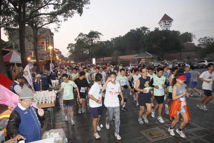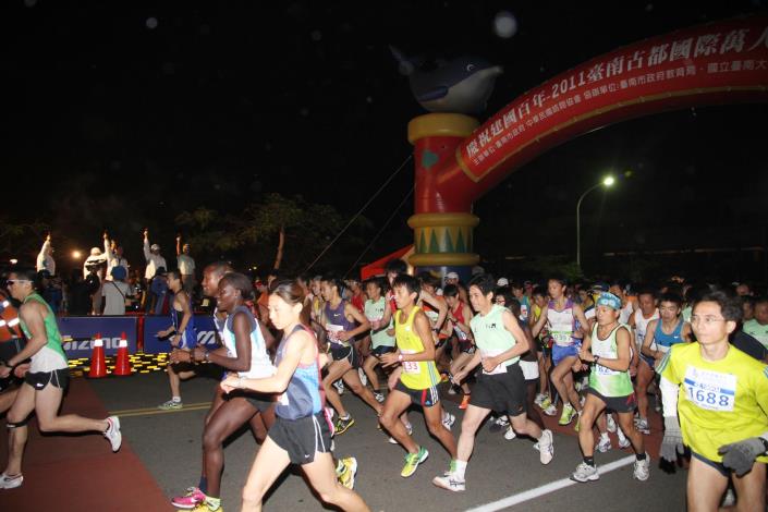 今(23)日清晨臺南市的街道顯得特別熱鬧,來自全國熱愛路跑運動的選手,一早就在臺南市永華市政中心集結,準備參與臺南縣市合併首次大型國際賽事「2011臺南古都國際馬拉松賽」,市長賴清德十分重視這場賽事,清晨五點半也別於以往穿著輕便服裝,出現在會場為選手們加油打氣,今年報名人數踴躍,超過萬人參與,6點一到,市長賴清德、教育局長鄭邦鎮、中華民國路跑協會副理事長郭國雄等人準時鳴槍,數千名選手衝出,場面十分壯觀。