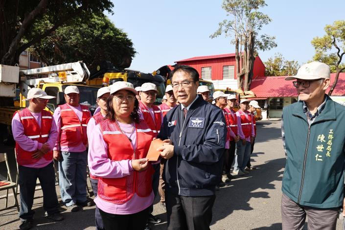 為感謝第一線基層同仁長年投入道路養護、公園維護及災後搶修等工作,台南市長黃偉哲今(13)日在工務局長陳世仁陪同下,前往第一工務大隊北門辦公室慰勞同仁並發放紅包,向辛苦付出的基層團隊表達關懷與肯定。工務第一線人員平時肩負道路修補、公園與行道樹整理等工作,長期在高溫酷暑與寒流低溫中作業,去年面對楠西地震、丹娜絲風災及跨縣市支援花蓮救災等任務,也都第一時間投入搶修與復原工作,展現高度行動力。現場同仁親手接過市長發送的「金馬伍吉」紅包,皆感受到年節前的溫暖鼓勵。