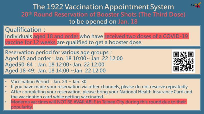 From 10:00 of Jan. 18 to 12:00 of Jan. 22, the 1922 Vaccination Appointment System will be reopened for the 20th round reservation of booster shots (the third dose), while the vaccination will be given between Jan. 24 and Jan. 30. Please make your reservation via https://1922.gov.tw/ , and please bring your National Health Insurance Card and the vaccination record when getting vaccinated. For more details, please refer to the appendix.